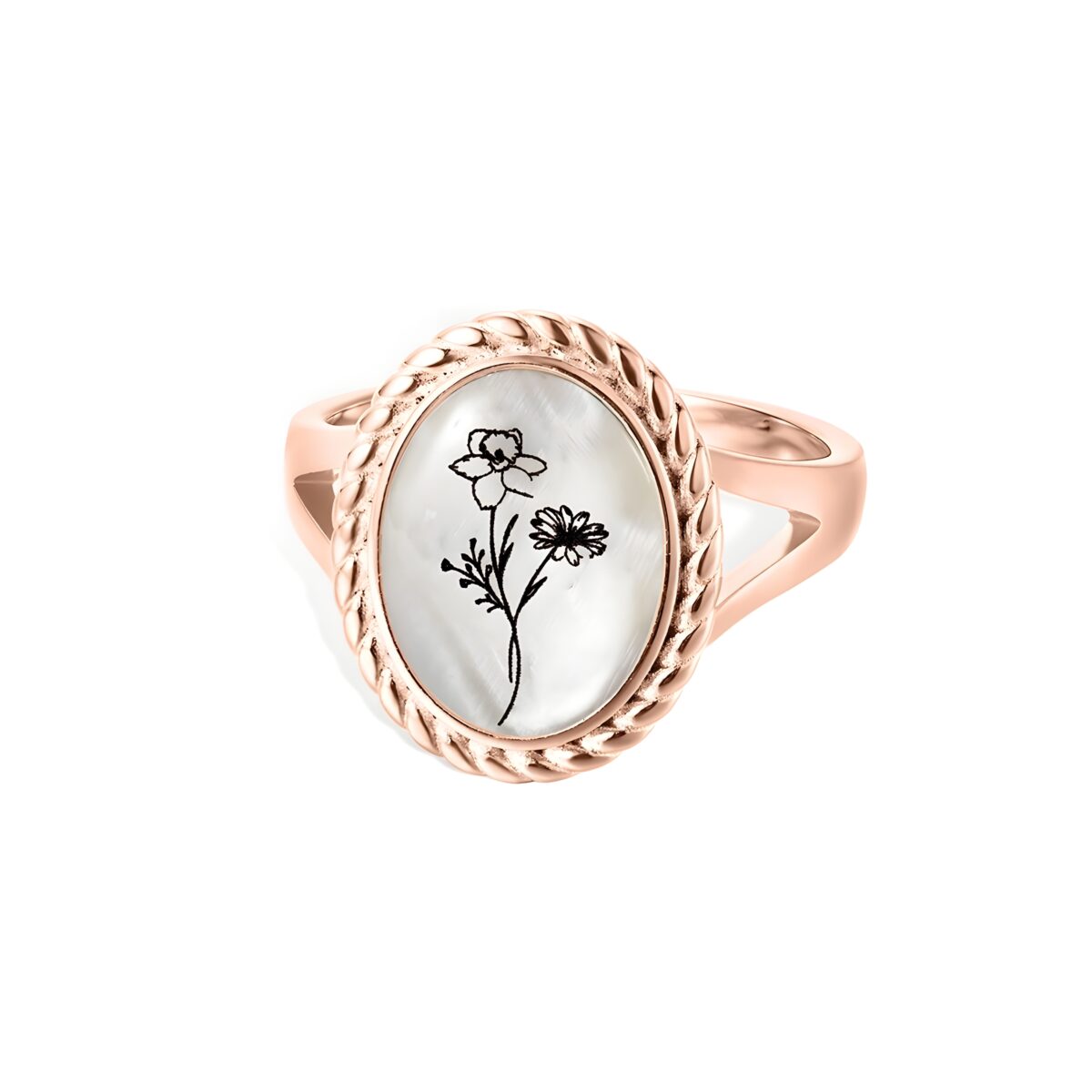 🌷 Celebrate her story with this engraved birth flower signet ring, featuring a luminous mother of pearl centerpiece and delicate floral bouquet design.