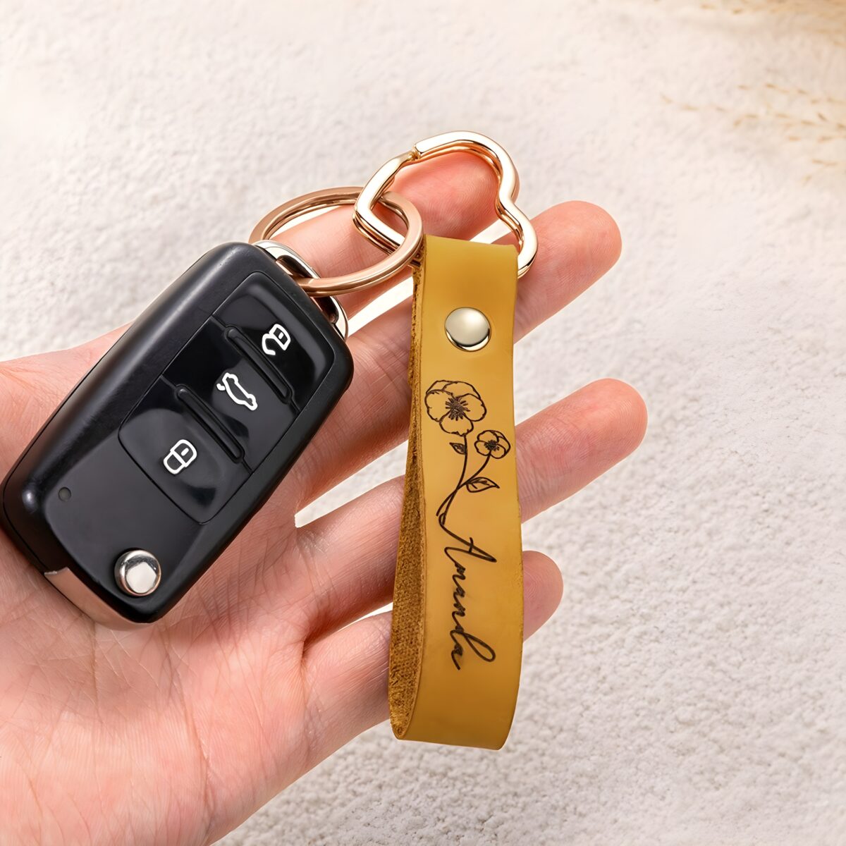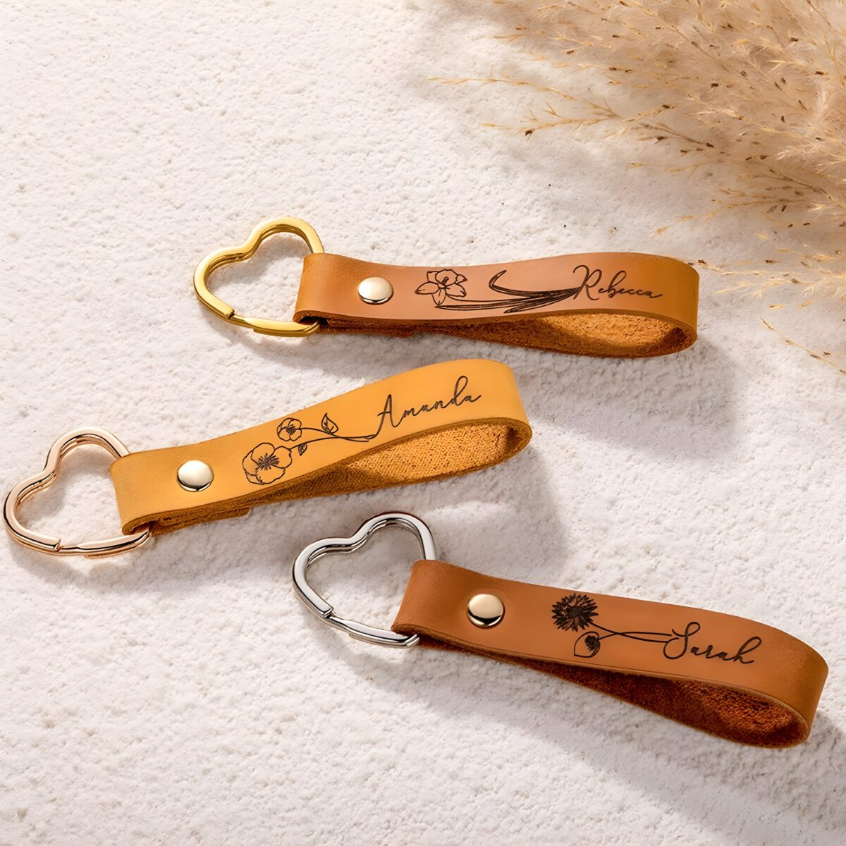 Carry Your Story – Custom Name & Birth Flower Leather Keychain – A Cherished Token for Her Everyday Moments