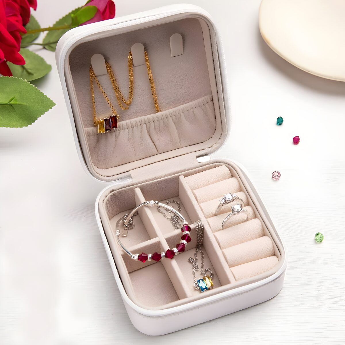 • 🌸 Everyday Joy – Compact yet spacious, this case fits effortlessly in luggage or handbags, keeping necklaces, rings, and bracelets secure and beautifully organized.