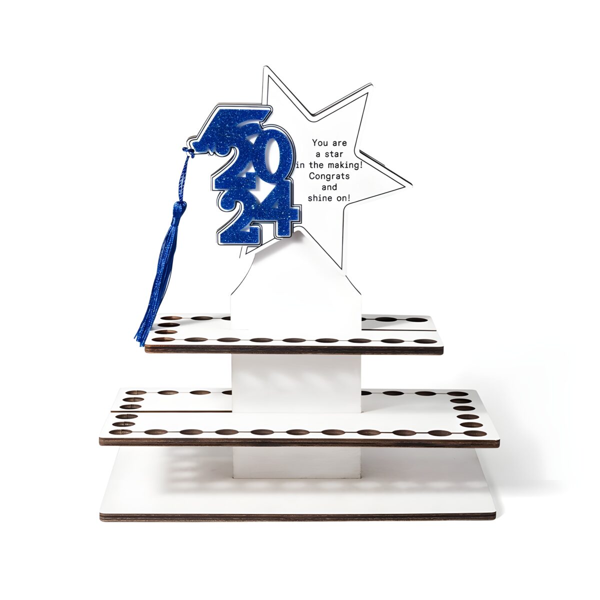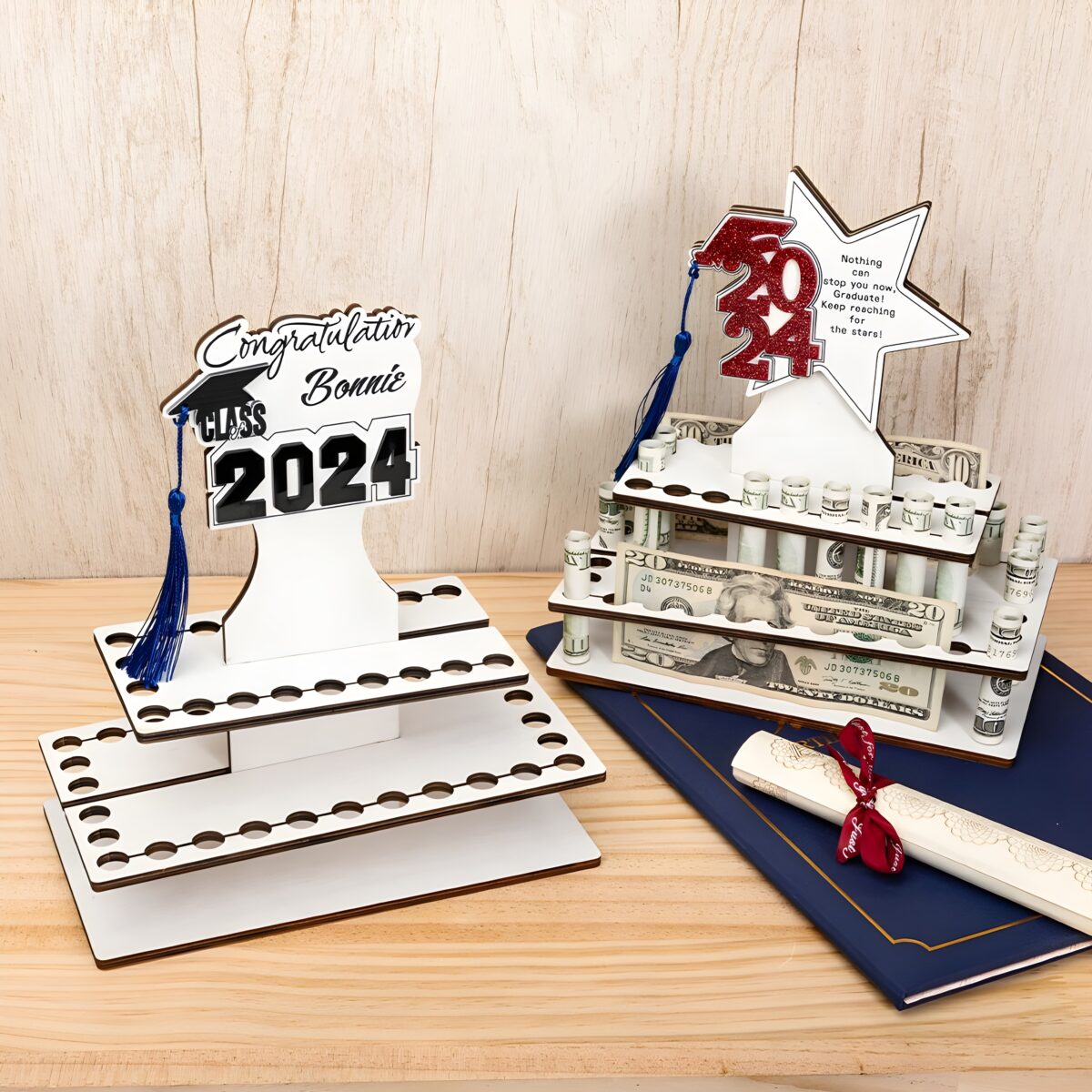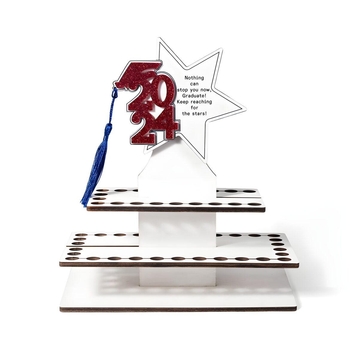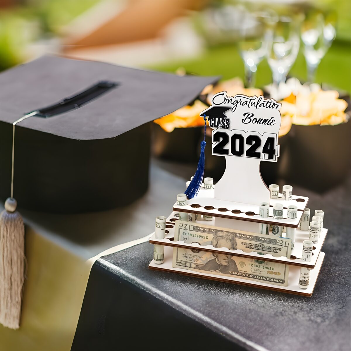 This beautifully crafted tiered cake money holder is designed for the proud Class of 2024 graduate. More than just decoration, it symbolizes the excitement and promise of new journeys ahead, making every celebration feel truly special and memorable.