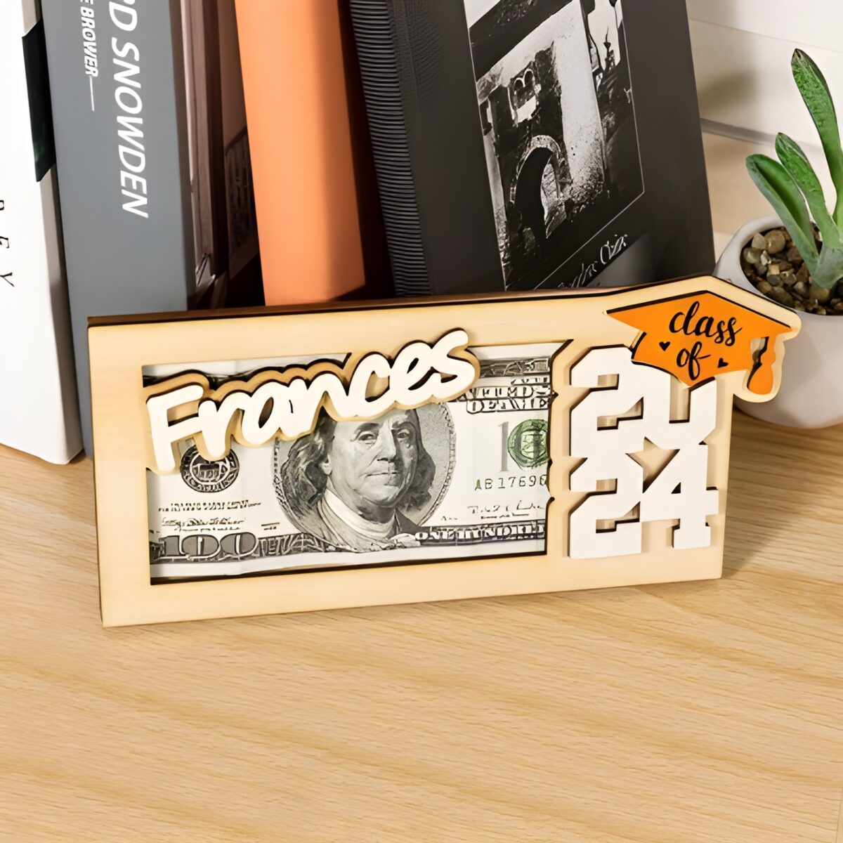 🎓 Present monetary gifts with warmth and style using this handcrafted wooden graduation cap money holder, personalized for the Class of 2024.
