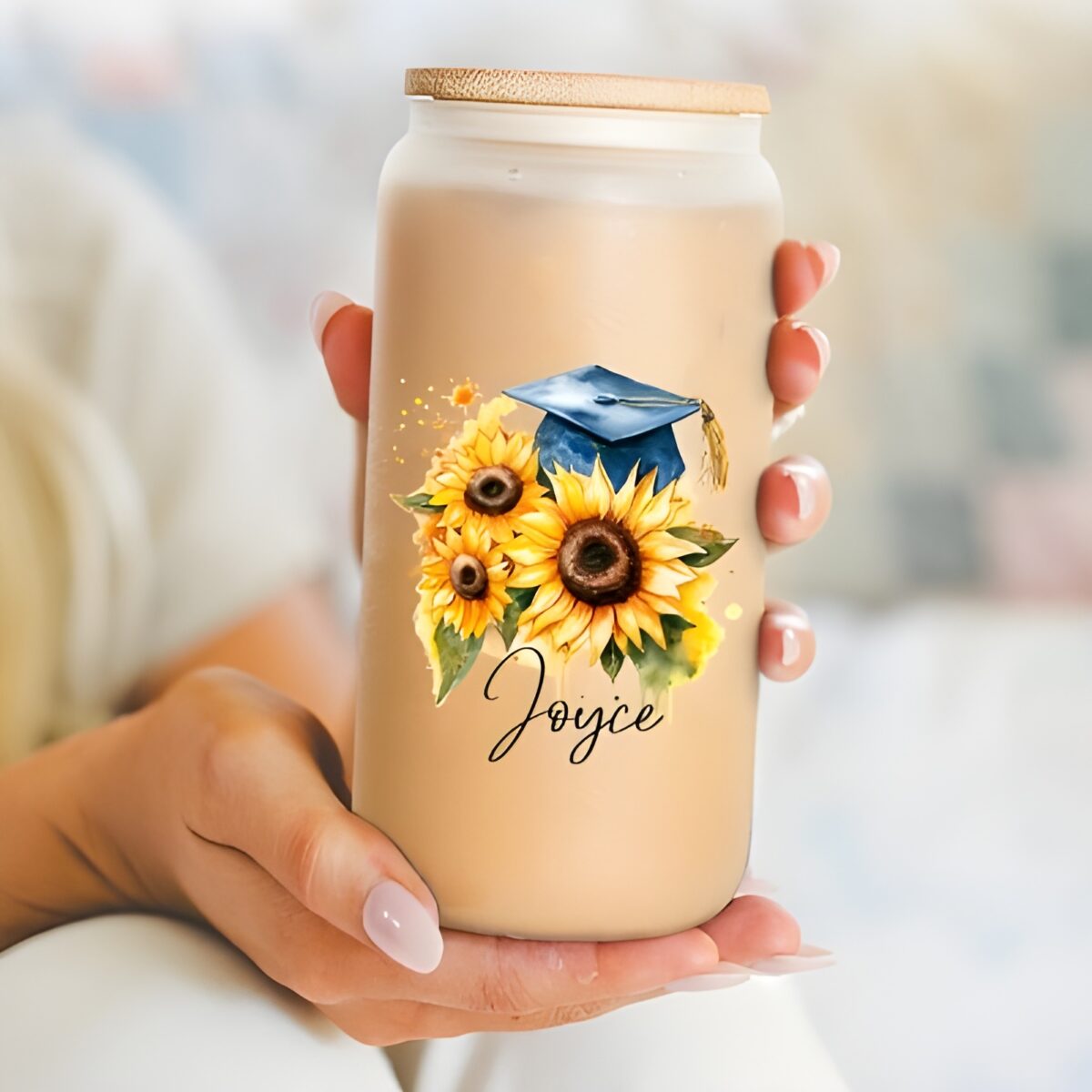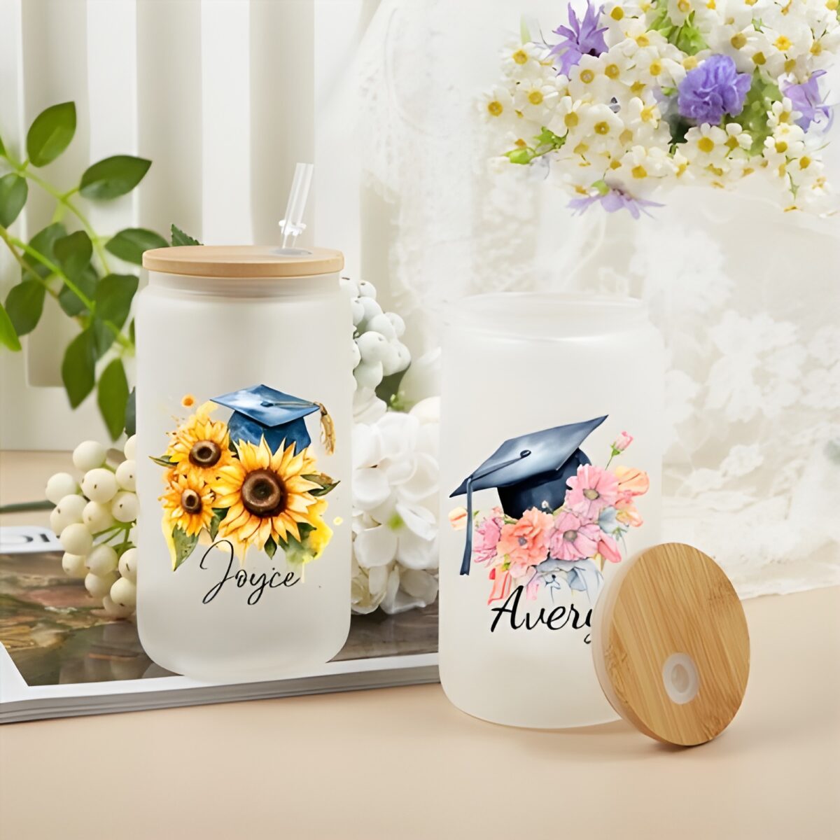 🎓 Celebrate achievement in style with this personalized frosted graduation glass cup featuring a floral cap design and bamboo lid with straw. A meaningful keepsake for every proud graduate.