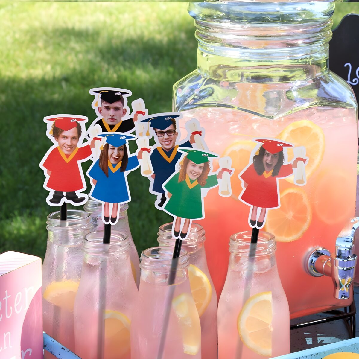 Make your graduation party unforgettable with these Custom Face Photo Drink Stirrers. Each swizzle stick showcases a fun graduation character topped with your uploaded photo, turning ordinary drinks into instant conversation starters.