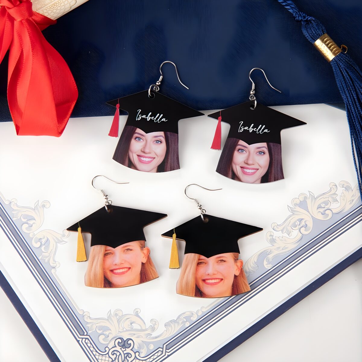 Celebrate the remarkable journey of a graduate with these heartfelt custom earrings. Designed to capture the unique spirit of your loved one, they transform a cherished photo and name into a wearable keepsake crowned with a graduation cap. Perfect for honoring milestones and sharing smiles at every celebration.